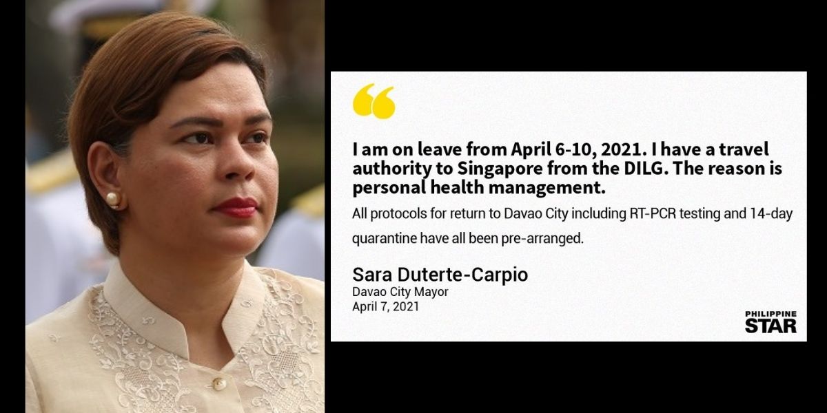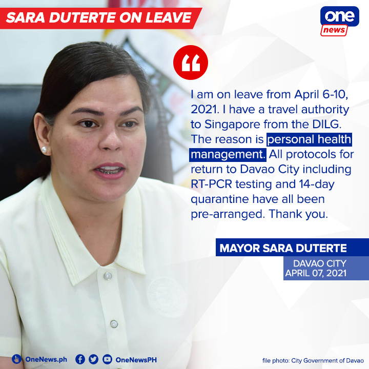 DAVAO CITYMayor Sara Duterte said on Wednesday that she went to on leave from April 6 to 10 and went to Singapore for personal health management reasons. A Twitter user juxtaposed events involving Davao City Mayor Sara Duterte-Carpio and Dra. I am on leave from April 6-10 2021.